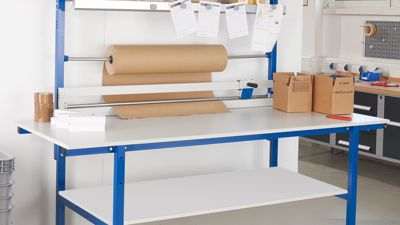 Der Packtisch verfügt über eine pulverbeschichtete Arbeitsplatte mit abgerundeten Kunststoffkanten und Stahlverstärkung. Die integrierte Abrollachse für Papier- oder Folienrollen bis 50 kg ermöglicht eine unkomplizierte Entnahme von Verpackungsmaterialien. Mit einer Belastbarkeit von bis zu 100 kg ist der Tisch für den intensiven täglichen Einsatz konzipiert.