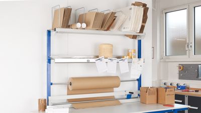 Das integrierte Tischaufbaumagazin ist perfekt für die übersichtliche Aufbewahrung von Faltkartons, Versandtaschen oder Kisten. Mit 8 Steckbügeln und einer Grösse von 1400 x 320 mm bietet es ausreichend Platz, um Ihre Verpackungsmaterialien griffbereit zu organisieren. So schaffen Sie eine aufgeräumte und effiziente Arbeitsumgebung.
