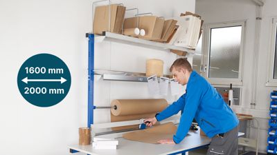 Der Komplett-Packtisch ist wahlweise mit einer 1600 mm oder 2000 mm breiten Arbeitsplatte erhältlich. Beide Grössen bieten ausreichend Platz für alle Verpackungs- und Versandarbeiten und ermöglichen Flexibilität bei der Arbeitsplatzgestaltung. Die stabile Konstruktion und die grosszügige Arbeitsfläche machen den Tisch zu einer idealen Lösung für jede Anforderung.